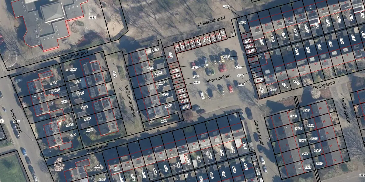 Het perceel waarop Simsonplein 4-7 staat heeft een oppervlakte van 18 m². Dit is een klein perceel. De perceeloppervlakte wordt geregistreerd door het Kadaster. Gedetailleerde informatie over de maten van dit perceel kunt u vinden in het rapport Kadastrale kaart met maatvoering van Simsonplein 4-7.