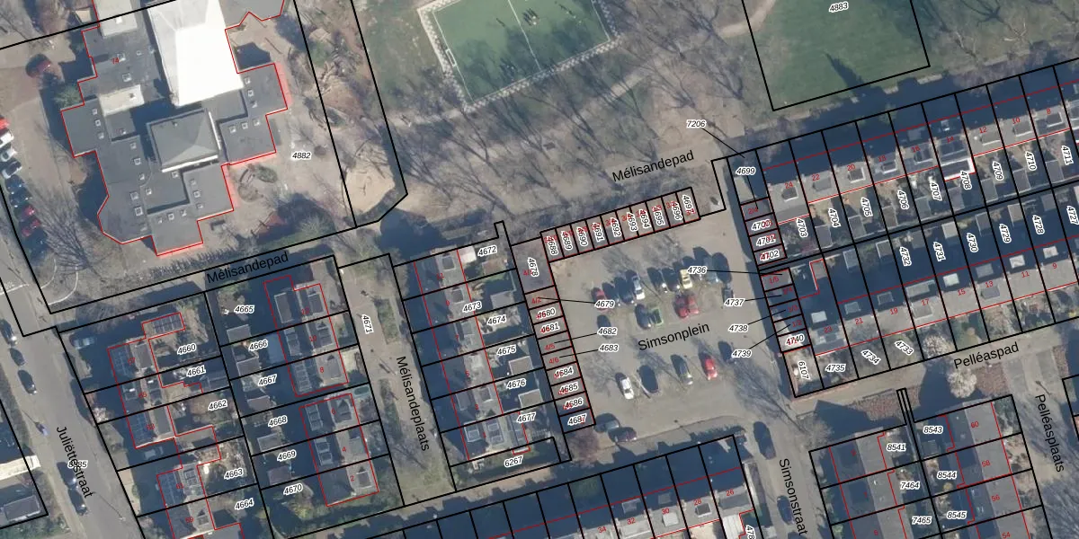 Het perceel waarop Simsonplein 4-1 staat heeft een oppervlakte van 56 m². Dit is een klein perceel. De perceeloppervlakte wordt geregistreerd door het Kadaster. Gedetailleerde informatie over de maten van dit perceel kunt u vinden in het rapport Kadastrale kaart met maatvoering van Simsonplein 4-1.