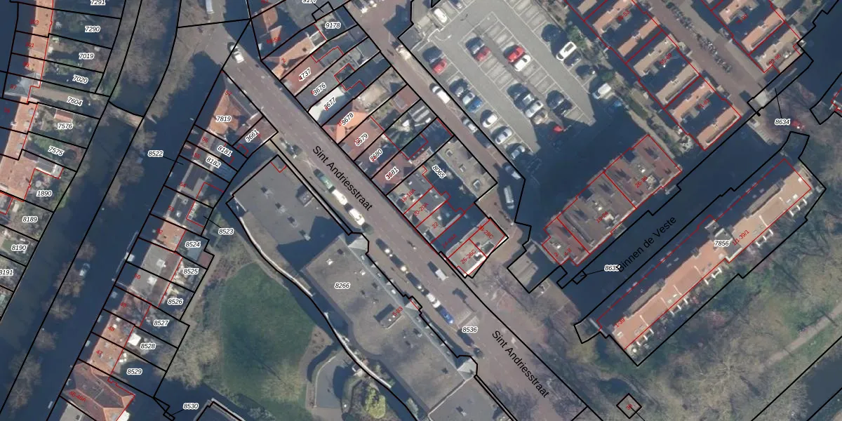 Het perceel waarop Sint Andriesstraat 20-A staat heeft een oppervlakte van 505 m². Dit is een groot perceel. De perceeloppervlakte wordt geregistreerd door het Kadaster. Gedetailleerde informatie over de maten van dit perceel kunt u vinden in het rapport Kadastrale kaart met maatvoering van Sint Andriesstraat 20-A.