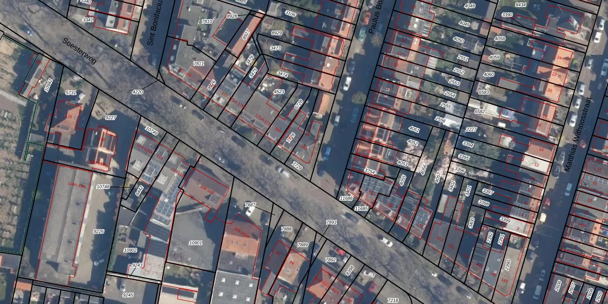 Soesterweg 165 is gelegen op kadastraal perceel AMF00D7729. Deze kadastrale aanduiding is uniek en wordt gebruikt door het Kadaster om eigendomsrechten en andere zakelijke rechten vast te leggen. Het perceel maakt onderdeel uit van de kadastrale gemeente Amersfoort.