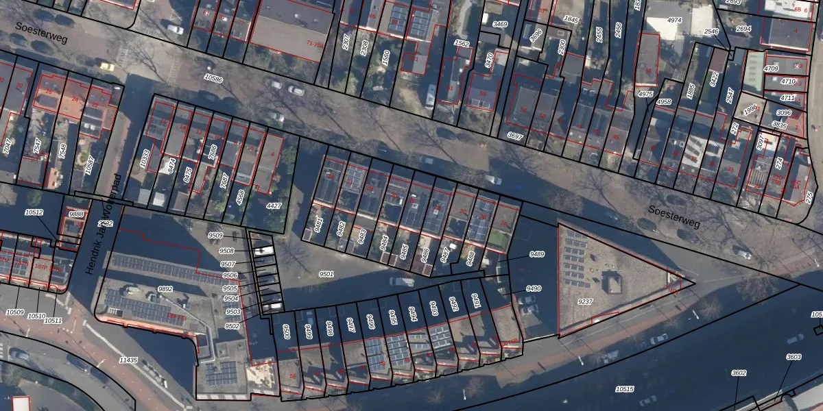 Soesterweg 2-E is gelegen op kadastraal perceel AMF00D9485. Deze kadastrale aanduiding is uniek en wordt gebruikt door het Kadaster om eigendomsrechten en andere zakelijke rechten vast te leggen. Het perceel maakt onderdeel uit van de kadastrale gemeente Amersfoort.
