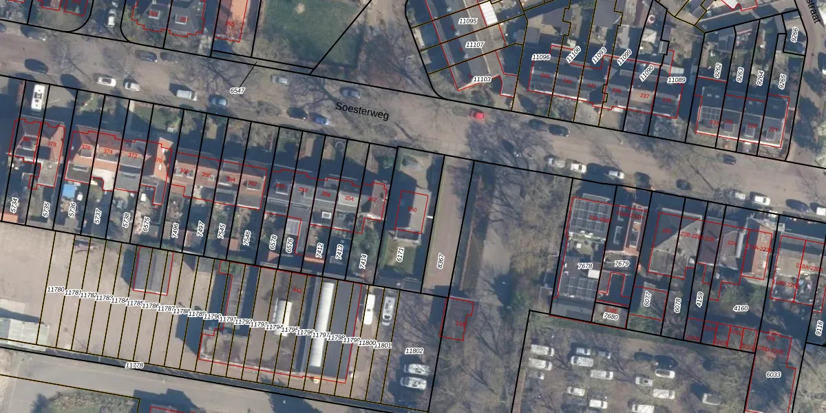 Soesterweg 350 is gelegen op kadastraal perceel AMF00D6171. Deze kadastrale aanduiding is uniek en wordt gebruikt door het Kadaster om eigendomsrechten en andere zakelijke rechten vast te leggen. Het perceel maakt onderdeel uit van de kadastrale gemeente Amersfoort.