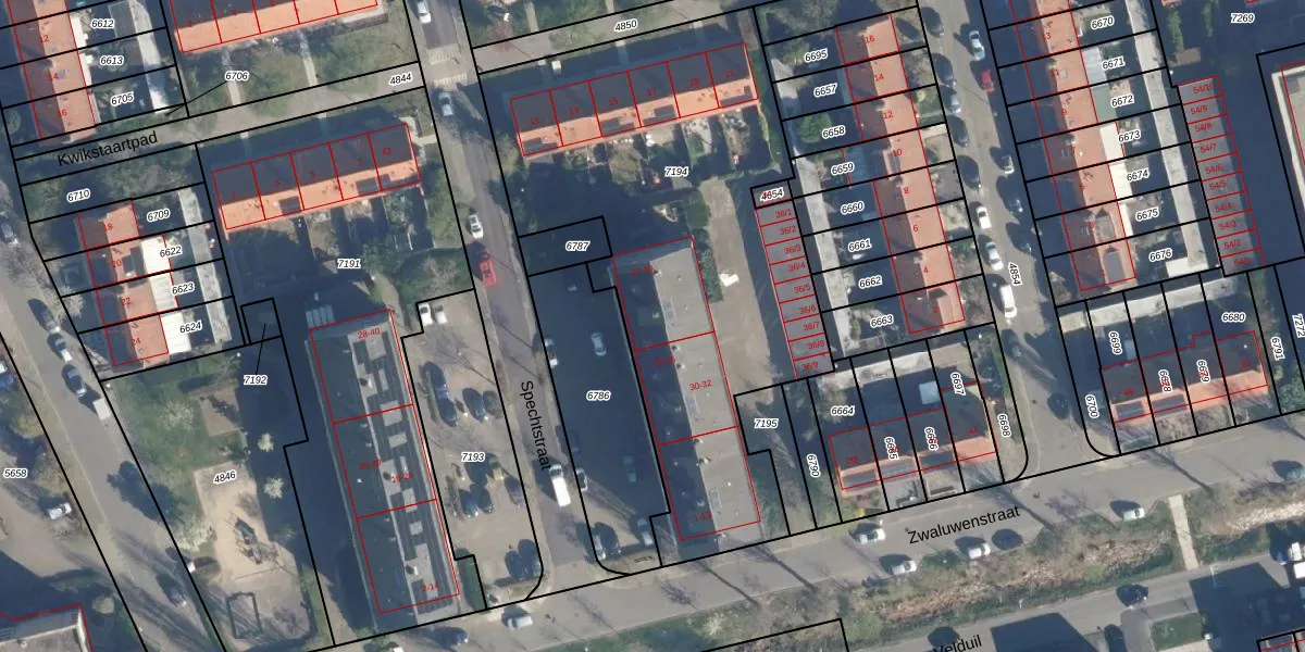 Het perceel waarop Spechtstraat 31 staat heeft een oppervlakte van 2426 m². Dit is een zeer groot perceel. De perceeloppervlakte wordt geregistreerd door het Kadaster. Gedetailleerde informatie over de maten van dit perceel kunt u vinden in het rapport Kadastrale kaart met maatvoering van Spechtstraat 31.