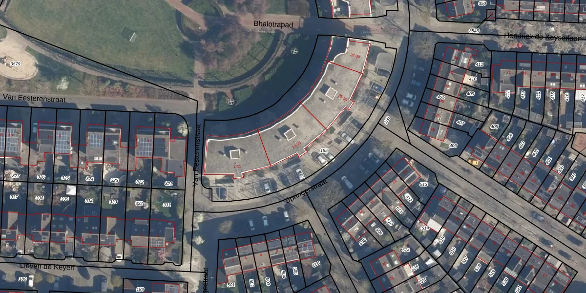 Het perceel waarop Springerstraat 17 staat heeft een oppervlakte van 2040 m². Dit is een zeer groot perceel. De perceeloppervlakte wordt geregistreerd door het Kadaster. Gedetailleerde informatie over de maten van dit perceel kunt u vinden in het rapport Kadastrale kaart met maatvoering van Springerstraat 17.