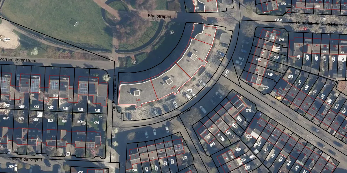 Het perceel waarop Springerstraat 19 staat heeft een oppervlakte van 2040 m². Dit is een zeer groot perceel. De perceeloppervlakte wordt geregistreerd door het Kadaster. Gedetailleerde informatie over de maten van dit perceel kunt u vinden in het rapport Kadastrale kaart met maatvoering van Springerstraat 19.