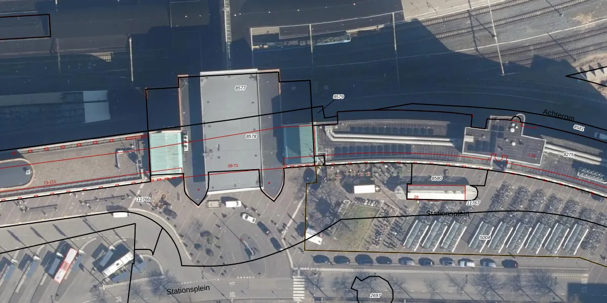 Het perceel waarop Stationsplein 39 staat heeft een oppervlakte van 1055 m². Dit is een zeer groot perceel. De perceeloppervlakte wordt geregistreerd door het Kadaster. Gedetailleerde informatie over de maten van dit perceel kunt u vinden in het rapport Kadastrale kaart met maatvoering van Stationsplein 39.