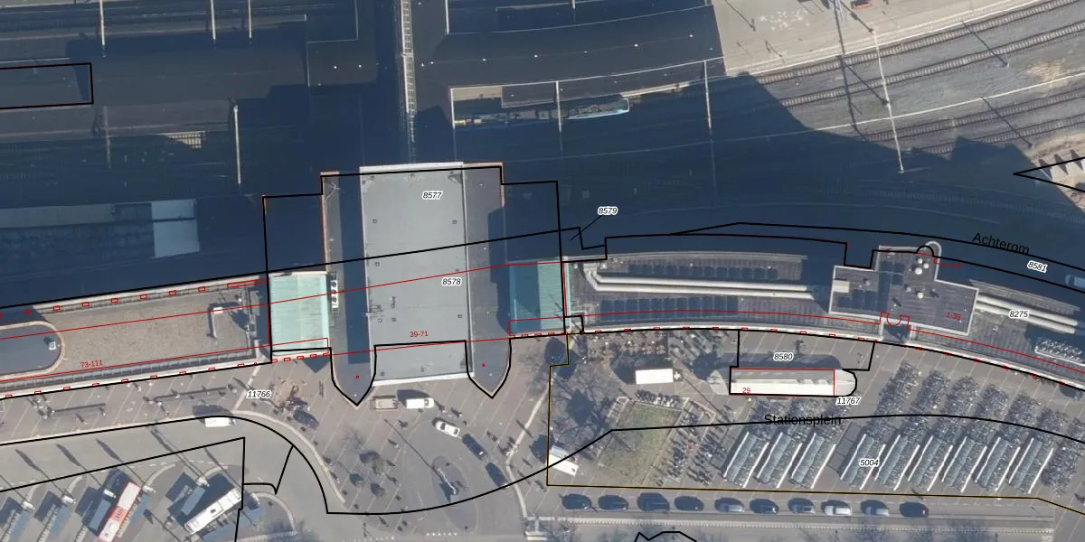 Het perceel waarop Stationsplein 43 staat heeft een oppervlakte van 1055 m². Dit is een zeer groot perceel. De perceeloppervlakte wordt geregistreerd door het Kadaster. Gedetailleerde informatie over de maten van dit perceel kunt u vinden in het rapport Kadastrale kaart met maatvoering van Stationsplein 43.
