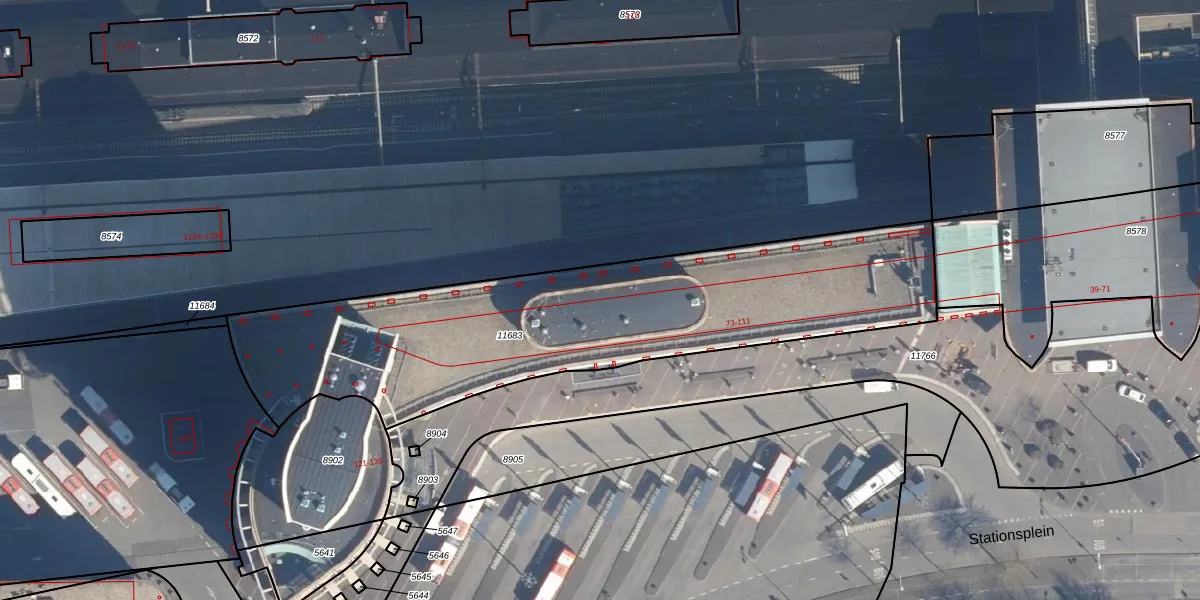 Het perceel waarop Stationsplein 91 staat heeft een oppervlakte van 2025 m². Dit is een zeer groot perceel. De perceeloppervlakte wordt geregistreerd door het Kadaster. Gedetailleerde informatie over de maten van dit perceel kunt u vinden in het rapport Kadastrale kaart met maatvoering van Stationsplein 91.