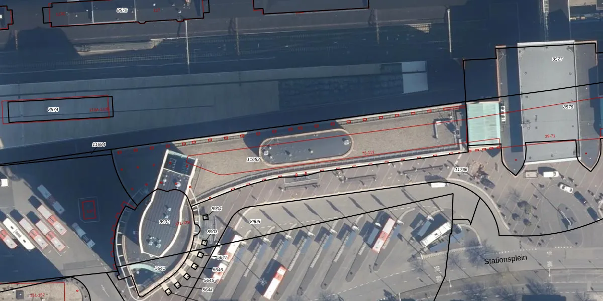 Het perceel waarop Stationsplein 99 staat heeft een oppervlakte van 2025 m². Dit is een zeer groot perceel. De perceeloppervlakte wordt geregistreerd door het Kadaster. Gedetailleerde informatie over de maten van dit perceel kunt u vinden in het rapport Kadastrale kaart met maatvoering van Stationsplein 99.