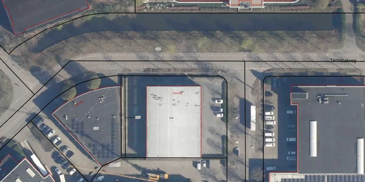 Het perceel waarop Terminalweg 21-D staat heeft een oppervlakte van 2510 m². Dit is een zeer groot perceel. De perceeloppervlakte wordt geregistreerd door het Kadaster. Gedetailleerde informatie over de maten van dit perceel kunt u vinden in het rapport Kadastrale kaart met maatvoering van Terminalweg 21-D.