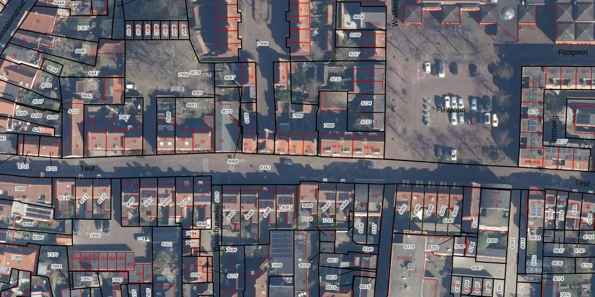 Het perceel waarop Teut 40 staat heeft een oppervlakte van 332 m². Dit is een groot perceel. De perceeloppervlakte wordt geregistreerd door het Kadaster. Gedetailleerde informatie over de maten van dit perceel kunt u vinden in het rapport Kadastrale kaart met maatvoering van Teut 40.