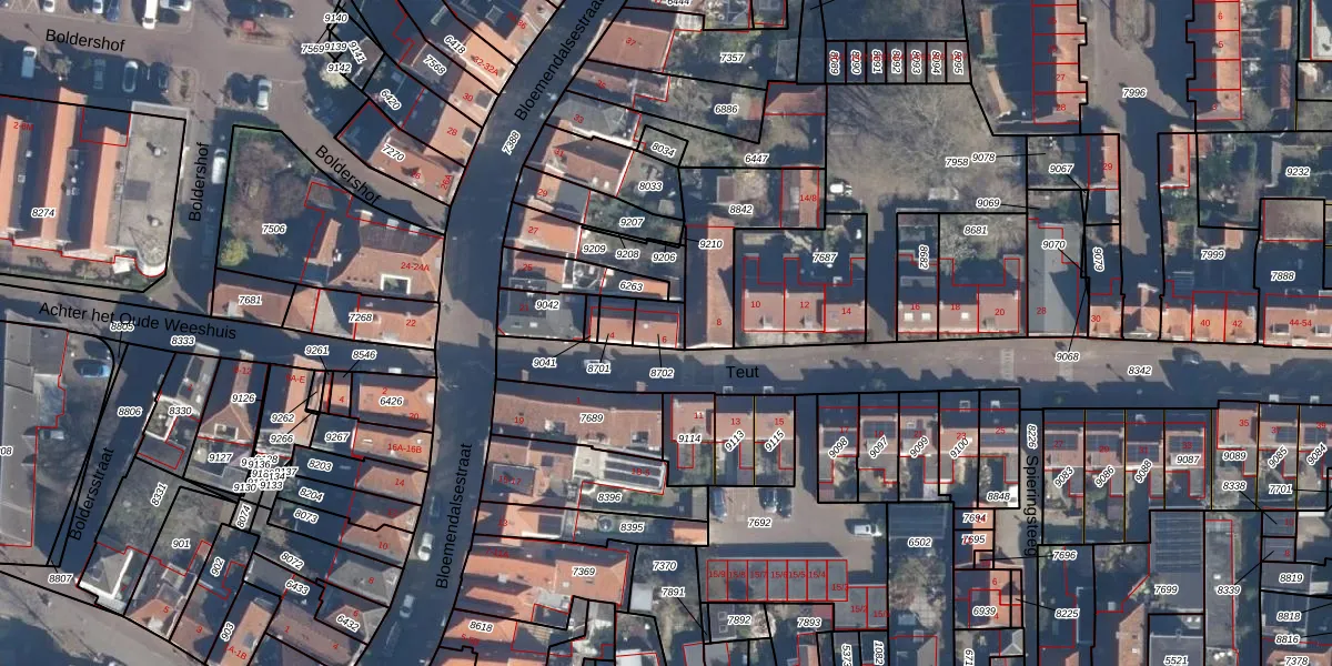 Het perceel waarop Teut 6 staat heeft een oppervlakte van 55 m². Dit is een klein perceel. De perceeloppervlakte wordt geregistreerd door het Kadaster. Gedetailleerde informatie over de maten van dit perceel kunt u vinden in het rapport Kadastrale kaart met maatvoering van Teut 6.