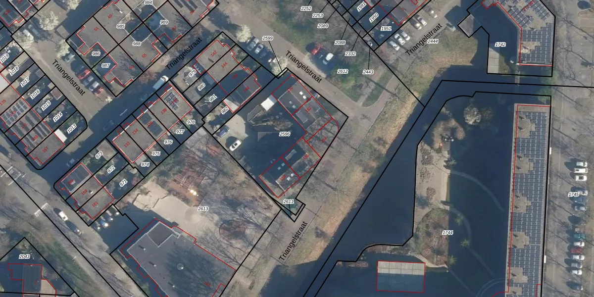 Triangelstraat 156 is gelegen op kadastraal perceel AMF00N2596. Deze kadastrale aanduiding is uniek en wordt gebruikt door het Kadaster om eigendomsrechten en andere zakelijke rechten vast te leggen. Het perceel maakt onderdeel uit van de kadastrale gemeente Amersfoort.