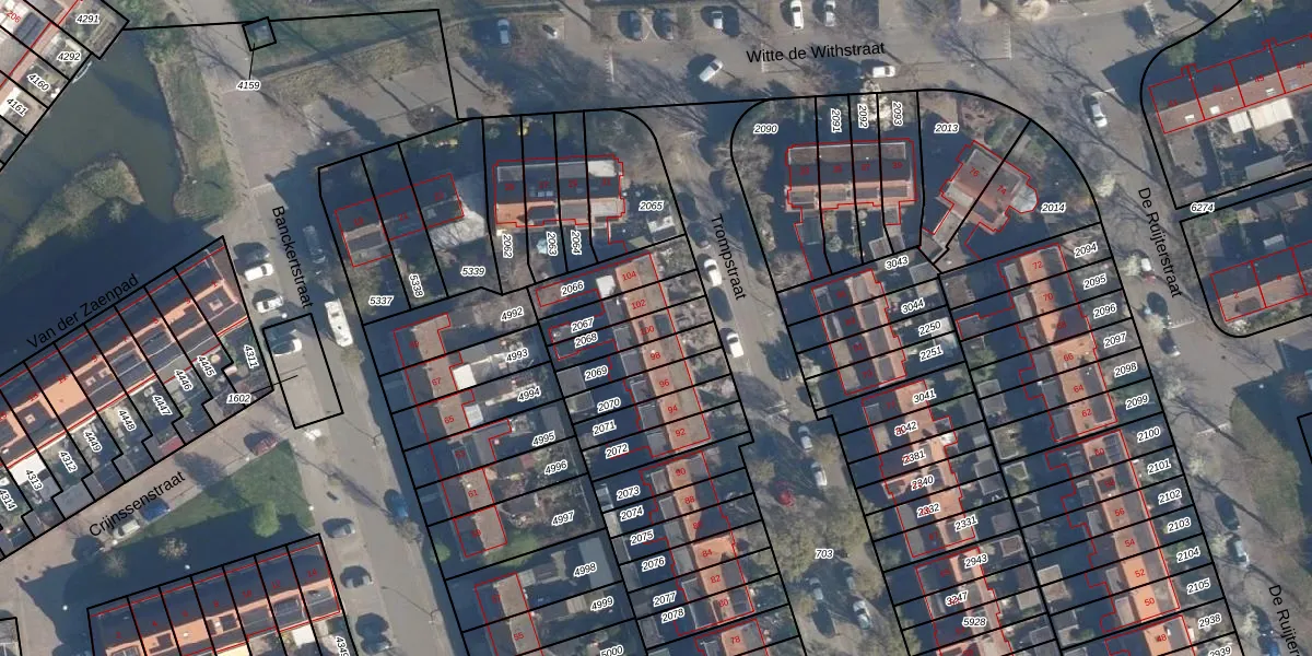 Het perceel waarop Trompstraat 100 staat heeft een oppervlakte van 106 m². Dit is een middelgroot perceel. De perceeloppervlakte wordt geregistreerd door het Kadaster. Gedetailleerde informatie over de maten van dit perceel kunt u vinden in het rapport Kadastrale kaart met maatvoering van Trompstraat 100.