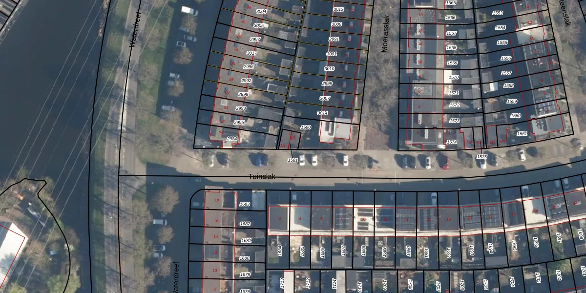 Het perceel waarop Tuinslak 1-2 staat heeft een oppervlakte van 41 m². Dit is een klein perceel. De perceeloppervlakte wordt geregistreerd door het Kadaster. Gedetailleerde informatie over de maten van dit perceel kunt u vinden in het rapport Kadastrale kaart met maatvoering van Tuinslak 1-2.