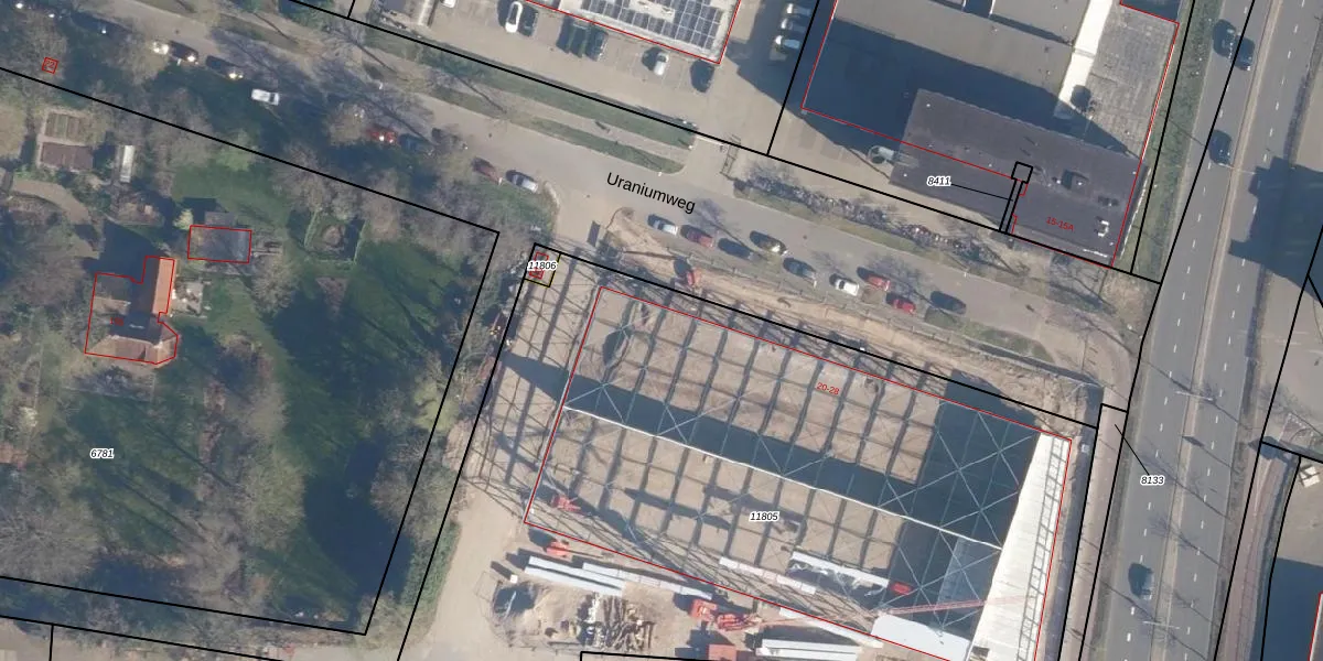 Het perceel waarop Uraniumweg 28 staat heeft een oppervlakte van 5473 m². Dit is een zeer groot perceel. De perceeloppervlakte wordt geregistreerd door het Kadaster. Gedetailleerde informatie over de maten van dit perceel kunt u vinden in het rapport Kadastrale kaart met maatvoering van Uraniumweg 28.