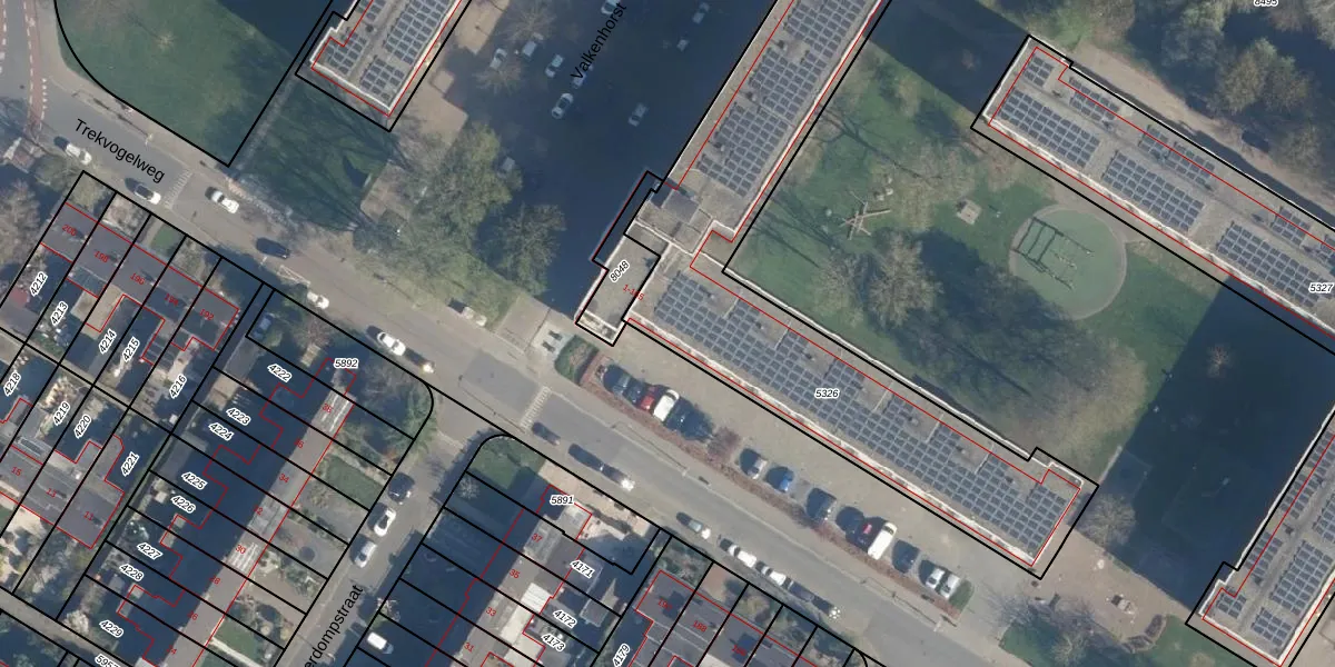 Het perceel waarop Valkenhorst 23 staat heeft een oppervlakte van 1821 m². Dit is een zeer groot perceel. De perceeloppervlakte wordt geregistreerd door het Kadaster. Gedetailleerde informatie over de maten van dit perceel kunt u vinden in het rapport Kadastrale kaart met maatvoering van Valkenhorst 23.