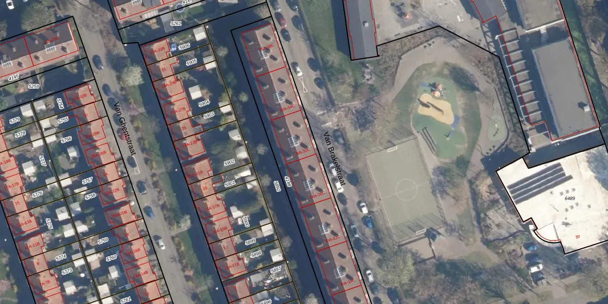 Het perceel waarop Van Brakelstraat 28-B staat heeft een oppervlakte van 1580 m². Dit is een zeer groot perceel. De perceeloppervlakte wordt geregistreerd door het Kadaster. Gedetailleerde informatie over de maten van dit perceel kunt u vinden in het rapport Kadastrale kaart met maatvoering van Van Brakelstraat 28-B.