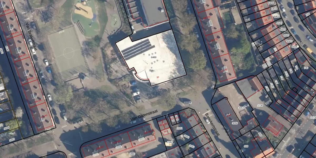 Van Galenstraat 30 is gelegen op kadastraal perceel AMF00G6489. Deze kadastrale aanduiding is uniek en wordt gebruikt door het Kadaster om eigendomsrechten en andere zakelijke rechten vast te leggen. Het perceel maakt onderdeel uit van de kadastrale gemeente Amersfoort.