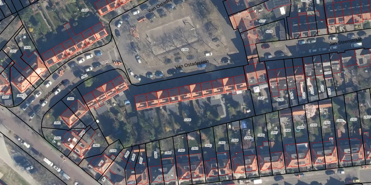 Het perceel waarop Van Ostadeplein 10 staat heeft een oppervlakte van 2767 m². Dit is een zeer groot perceel. De perceeloppervlakte wordt geregistreerd door het Kadaster. Gedetailleerde informatie over de maten van dit perceel kunt u vinden in het rapport Kadastrale kaart met maatvoering van Van Ostadeplein 10.