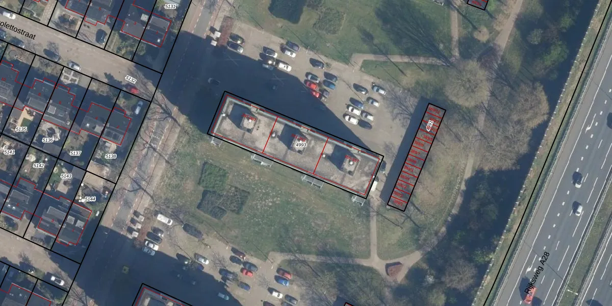 Het perceel waarop het adres ligt is AMF00-A-4993. De afkorting 'AMF00' staat voor kadastrale gemeente Amersfoort. De gemiddelde perceelgrootte in Amersfoort is 959,8 m². Dit perceel is kleiner: de perceeloppervlakte bedraagt 840 m². Het kleinste perceel in de kadastrale gemeente is 0 m² groot. De grootste perceeloppervlakte is 1,12 km². Op het perceel zijn 51 adressen aanwezig. In de Basisregistratie Kadaster (BRK) werden de grenzen van het perceel geregistreerd op 03-12-2009.