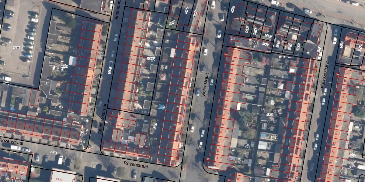 Het perceel waarop Violenstraat 62 staat heeft een oppervlakte van 2170 m². Dit is een zeer groot perceel. De perceeloppervlakte wordt geregistreerd door het Kadaster. Gedetailleerde informatie over de maten van dit perceel kunt u vinden in het rapport Kadastrale kaart met maatvoering van Violenstraat 62.