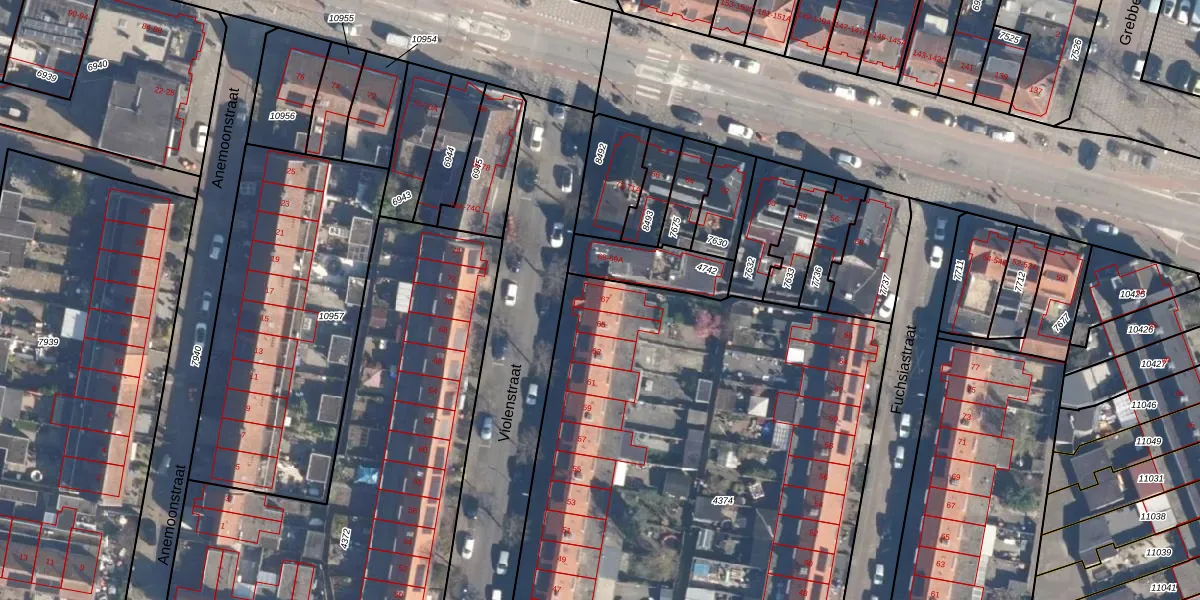 Het perceel waarop Violenstraat 67 staat heeft een oppervlakte van 5110 m². Dit is een zeer groot perceel. De perceeloppervlakte wordt geregistreerd door het Kadaster. Gedetailleerde informatie over de maten van dit perceel kunt u vinden in het rapport Kadastrale kaart met maatvoering van Violenstraat 67.