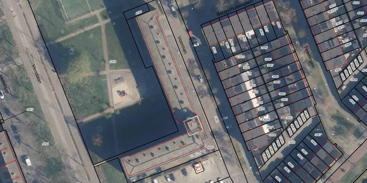 Het perceel waarop Voerman 4-2 staat heeft een oppervlakte van 2197 m². Dit is een zeer groot perceel. De perceeloppervlakte wordt geregistreerd door het Kadaster. Gedetailleerde informatie over de maten van dit perceel kunt u vinden in het rapport Kadastrale kaart met maatvoering van Voerman 4-2.