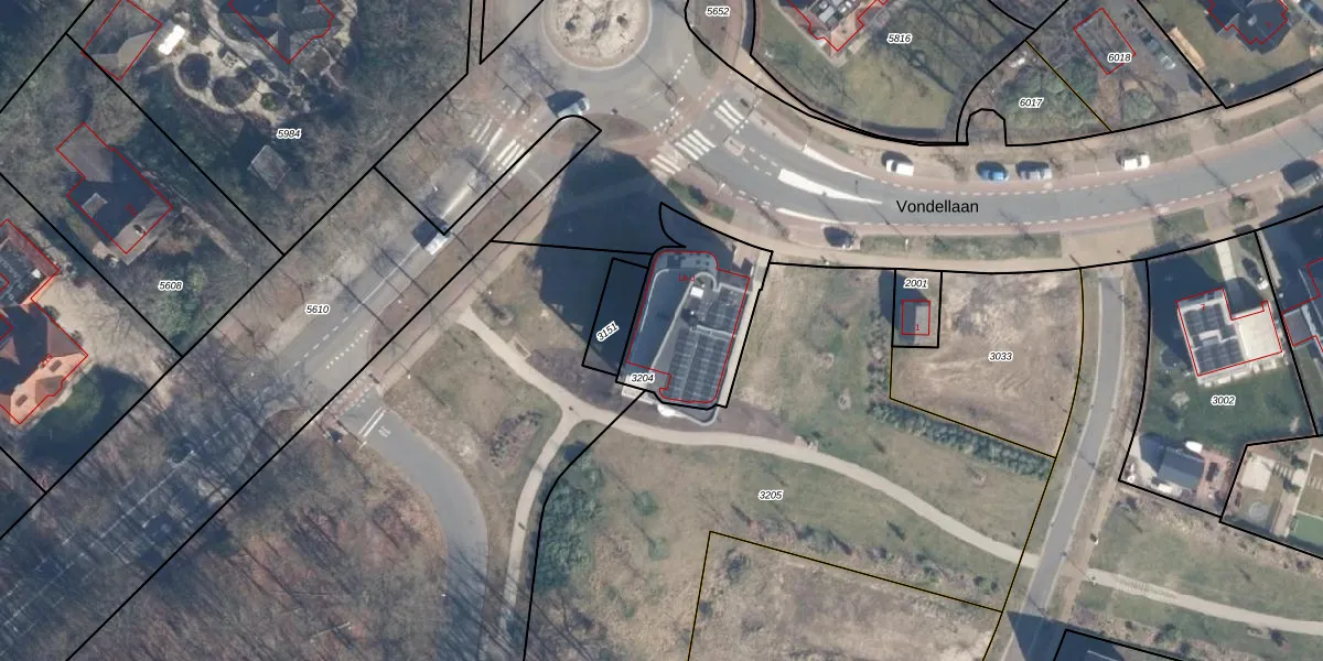 Het perceel waarop Vondellaan 1-F staat heeft een oppervlakte van 448 m². Dit is een groot perceel. De perceeloppervlakte wordt geregistreerd door het Kadaster. Gedetailleerde informatie over de maten van dit perceel kunt u vinden in het rapport Kadastrale kaart met maatvoering van Vondellaan 1-F.