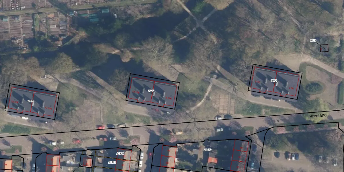 Vreeland 9 is gelegen op kadastraal perceel AMF00D7970. Deze kadastrale aanduiding is uniek en wordt gebruikt door het Kadaster om eigendomsrechten en andere zakelijke rechten vast te leggen. Het perceel maakt onderdeel uit van de kadastrale gemeente Amersfoort.