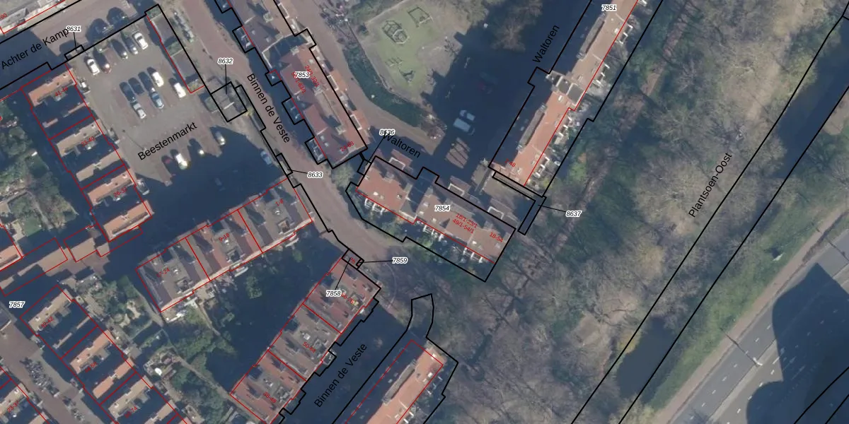 Het perceel waarop Waltoren 54 staat heeft een oppervlakte van 555 m². Dit is een groot perceel. De perceeloppervlakte wordt geregistreerd door het Kadaster. Gedetailleerde informatie over de maten van dit perceel kunt u vinden in het rapport Kadastrale kaart met maatvoering van Waltoren 54.