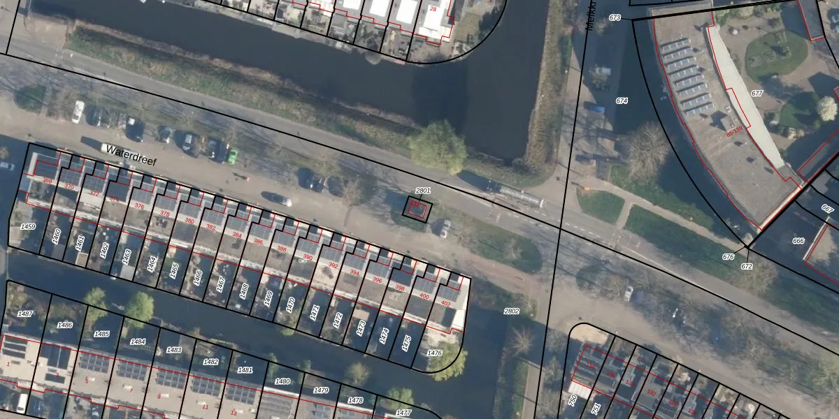 Waterdreef 404 is gelegen op kadastraal perceel AMF00P2801. Deze kadastrale aanduiding is uniek en wordt gebruikt door het Kadaster om eigendomsrechten en andere zakelijke rechten vast te leggen. Het perceel maakt onderdeel uit van de kadastrale gemeente Amersfoort.