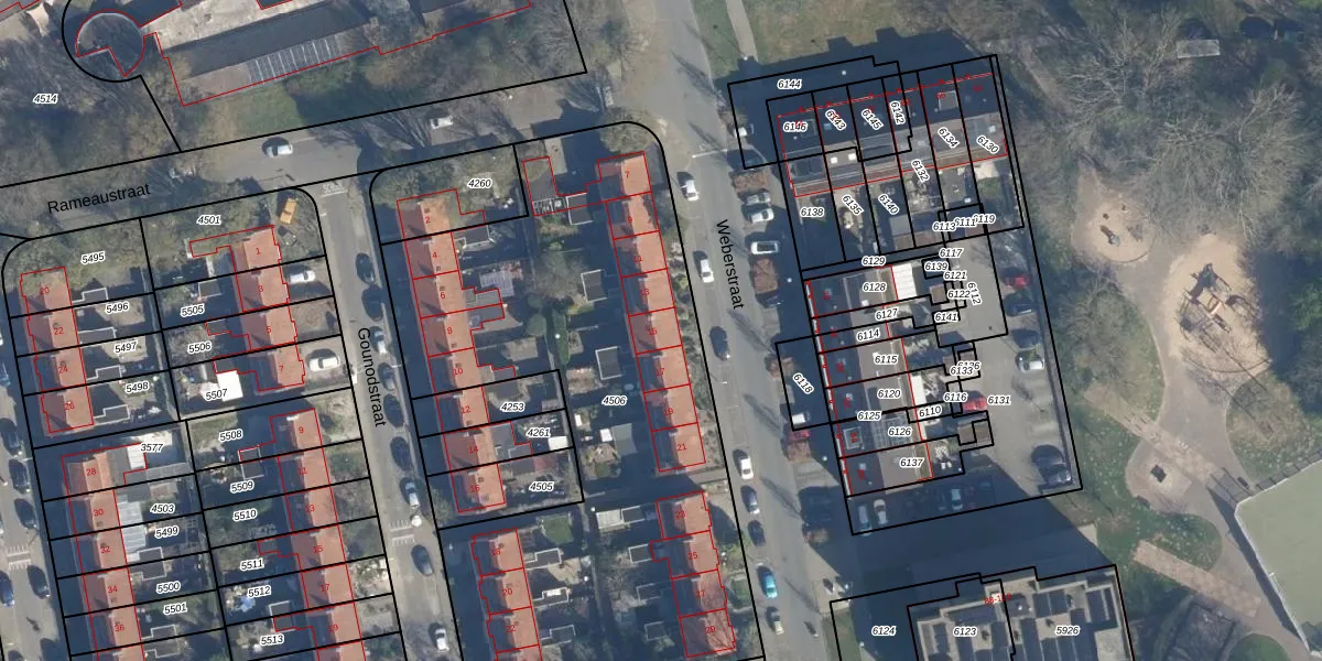 Het perceel waarop Weberstraat 15 staat heeft een oppervlakte van 3000 m². Dit is een zeer groot perceel. De perceeloppervlakte wordt geregistreerd door het Kadaster. Gedetailleerde informatie over de maten van dit perceel kunt u vinden in het rapport Kadastrale kaart met maatvoering van Weberstraat 15.