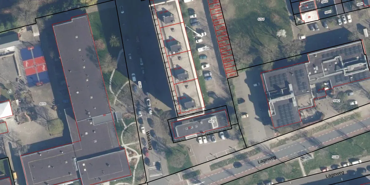 Het perceel waarop Wiekslag 63 staat heeft een oppervlakte van 2612 m². Dit is een zeer groot perceel. De perceeloppervlakte wordt geregistreerd door het Kadaster. Gedetailleerde informatie over de maten van dit perceel kunt u vinden in het rapport Kadastrale kaart met maatvoering van Wiekslag 63.