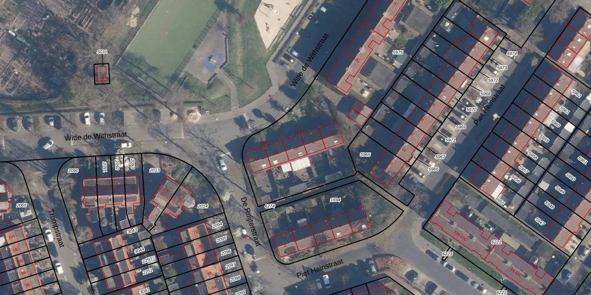 Het perceel waarop Witte de Withstraat 45 staat heeft een oppervlakte van 3405 m². Dit is een zeer groot perceel. De perceeloppervlakte wordt geregistreerd door het Kadaster. Gedetailleerde informatie over de maten van dit perceel kunt u vinden in het rapport Kadastrale kaart met maatvoering van Witte de Withstraat 45.