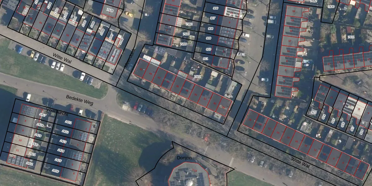 Het perceel waarop Witte Wal 36 staat heeft een oppervlakte van 1422 m². Dit is een zeer groot perceel. De perceeloppervlakte wordt geregistreerd door het Kadaster. Gedetailleerde informatie over de maten van dit perceel kunt u vinden in het rapport Kadastrale kaart met maatvoering van Witte Wal 36.