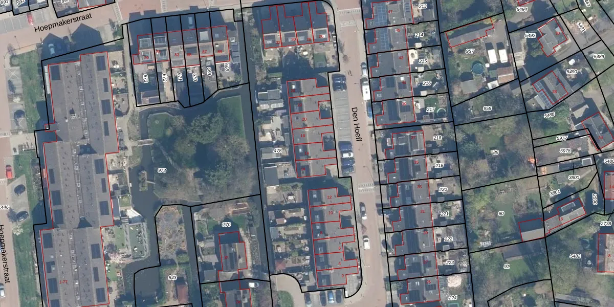 Het perceel waarop Den Hoeff 16 staat heeft een oppervlakte van 2630 m². Dit is een zeer groot perceel. De perceeloppervlakte wordt geregistreerd door het Kadaster. Gedetailleerde informatie over de maten van dit perceel kunt u vinden in het rapport Kadastrale kaart met maatvoering van Den Hoeff 16.