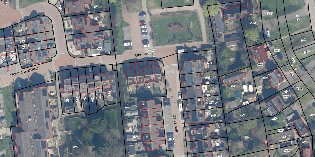 Het perceel waarop Den Hoeff 26 staat heeft een oppervlakte van 2630 m². Dit is een zeer groot perceel. De perceeloppervlakte wordt geregistreerd door het Kadaster. Gedetailleerde informatie over de maten van dit perceel kunt u vinden in het rapport Kadastrale kaart met maatvoering van Den Hoeff 26.