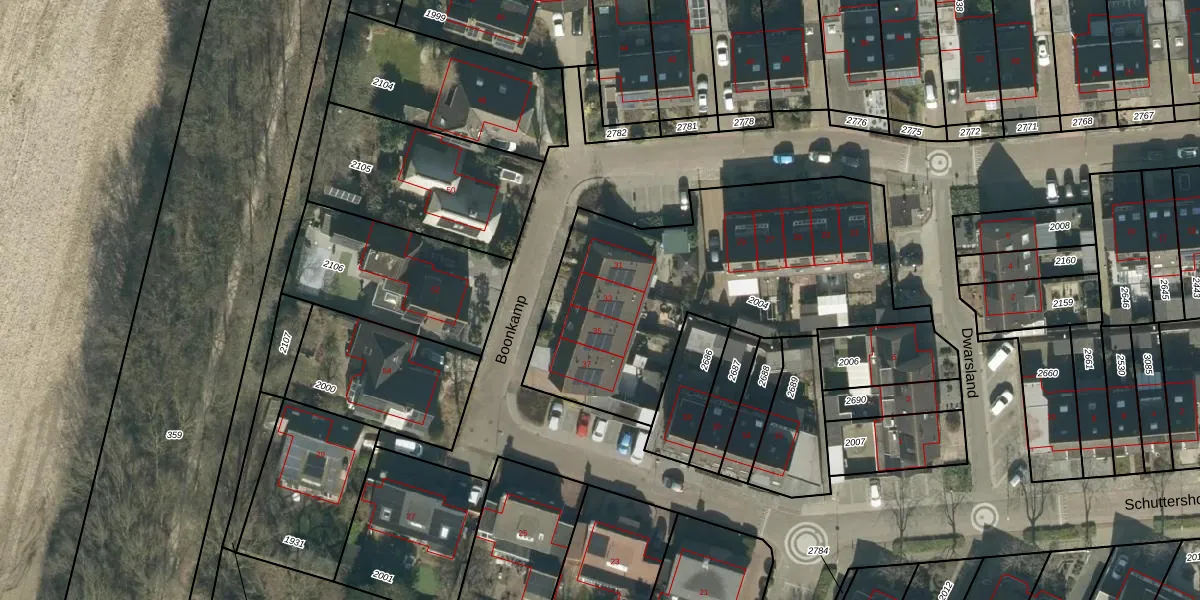 Het perceel waarop Boonkamp 33 staat heeft een oppervlakte van 1555 m². Dit is een zeer groot perceel. De perceeloppervlakte wordt geregistreerd door het Kadaster. Gedetailleerde informatie over de maten van dit perceel kunt u vinden in het rapport Kadastrale kaart met maatvoering van Boonkamp 33.
