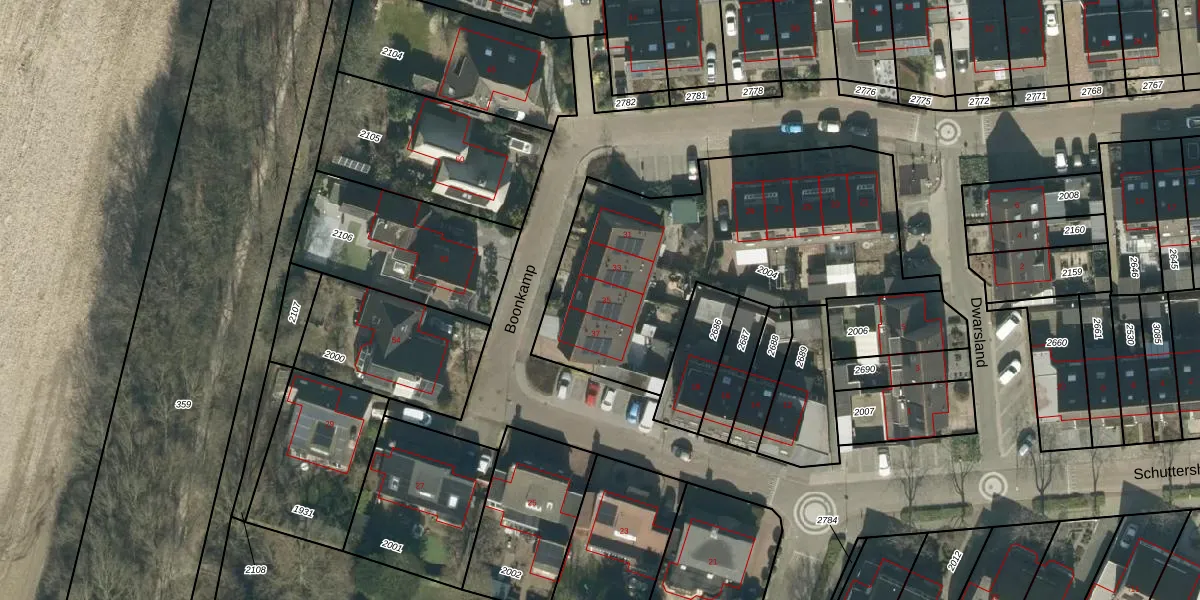 Het perceel waarop Boonkamp 35 staat heeft een oppervlakte van 1555 m². Dit is een zeer groot perceel. De perceeloppervlakte wordt geregistreerd door het Kadaster. Gedetailleerde informatie over de maten van dit perceel kunt u vinden in het rapport Kadastrale kaart met maatvoering van Boonkamp 35.