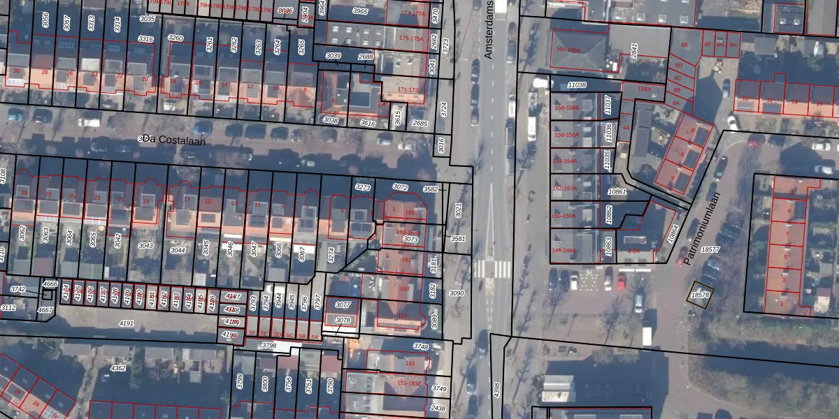 Amsterdamseweg 165 is gelegen op kadastraal perceel ASV00G3072. Deze kadastrale aanduiding is uniek en wordt gebruikt door het Kadaster om eigendomsrechten en andere zakelijke rechten vast te leggen. Het perceel maakt onderdeel uit van de kadastrale gemeente Amstelveen.