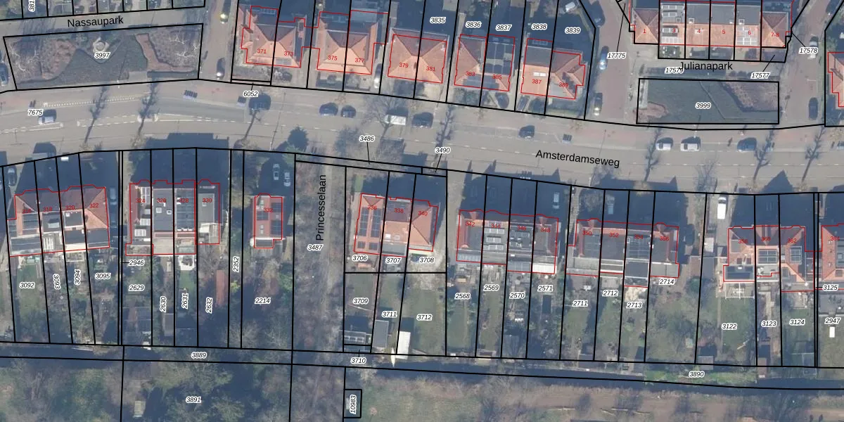 Amsterdamseweg 340 is gelegen op kadastraal perceel ASV00H3708. Deze kadastrale aanduiding is uniek en wordt gebruikt door het Kadaster om eigendomsrechten en andere zakelijke rechten vast te leggen. Het perceel maakt onderdeel uit van de kadastrale gemeente Amstelveen.