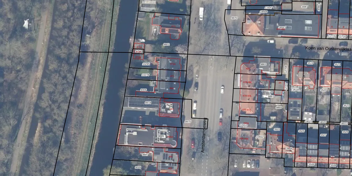 Amsterdamseweg 469 is gelegen op kadastraal perceel ASV00H9006. Deze kadastrale aanduiding is uniek en wordt gebruikt door het Kadaster om eigendomsrechten en andere zakelijke rechten vast te leggen. Het perceel maakt onderdeel uit van de kadastrale gemeente Amstelveen.