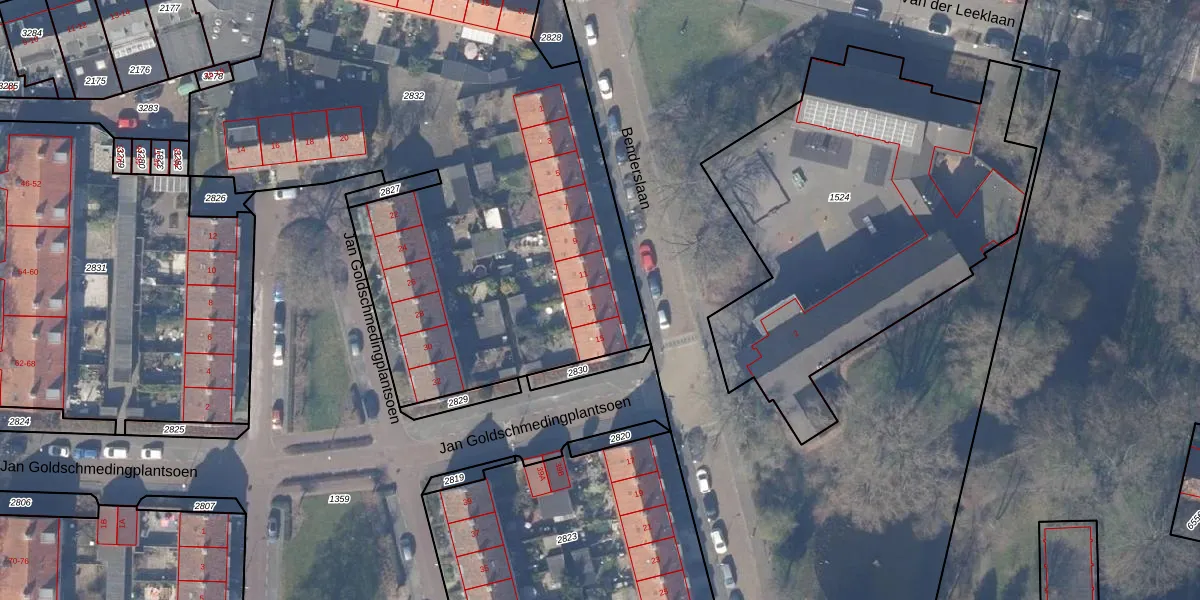 Het perceel waarop Benderslaan 13 staat heeft een oppervlakte van 3643 m². Dit is een zeer groot perceel. De perceeloppervlakte wordt geregistreerd door het Kadaster. Gedetailleerde informatie over de maten van dit perceel kunt u vinden in het rapport Kadastrale kaart met maatvoering van Benderslaan 13.