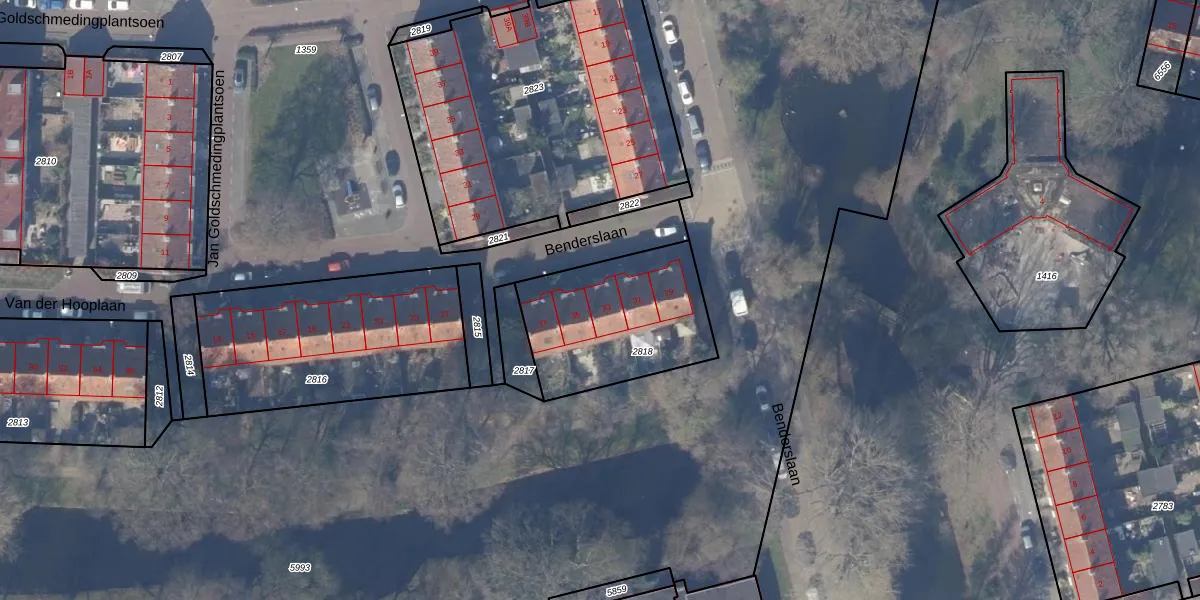 Het perceel waarop Benderslaan 33 staat heeft een oppervlakte van 602 m². Dit is een groot perceel. De perceeloppervlakte wordt geregistreerd door het Kadaster. Gedetailleerde informatie over de maten van dit perceel kunt u vinden in het rapport Kadastrale kaart met maatvoering van Benderslaan 33.