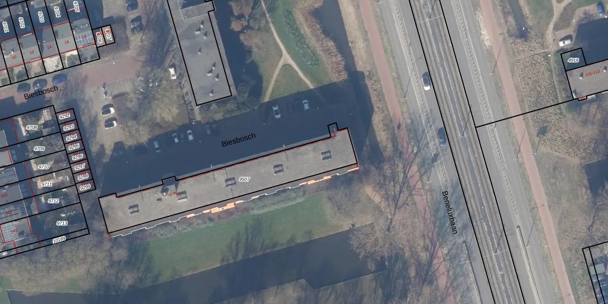 Biesbosch 77-D is gelegen op kadastraal perceel ASV00H9507. Deze kadastrale aanduiding is uniek en wordt gebruikt door het Kadaster om eigendomsrechten en andere zakelijke rechten vast te leggen. Het perceel maakt onderdeel uit van de kadastrale gemeente Amstelveen.