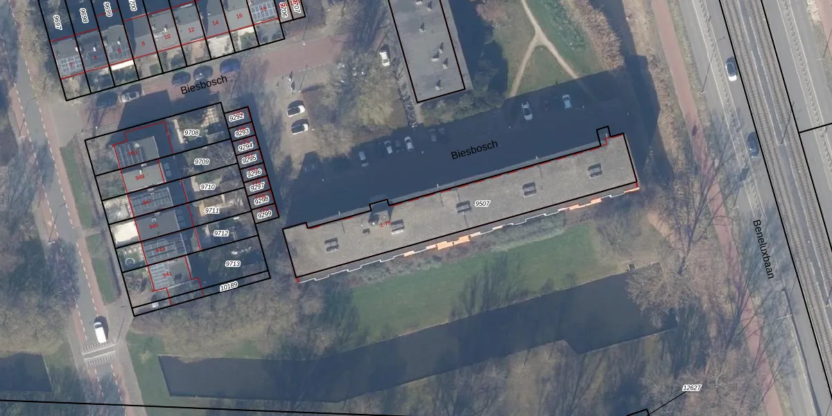 Het perceel waarop Biesbosch 77-M staat heeft een oppervlakte van 938 m². Dit is een groot perceel. De perceeloppervlakte wordt geregistreerd door het Kadaster. Gedetailleerde informatie over de maten van dit perceel kunt u vinden in het rapport Kadastrale kaart met maatvoering van Biesbosch 77-M.