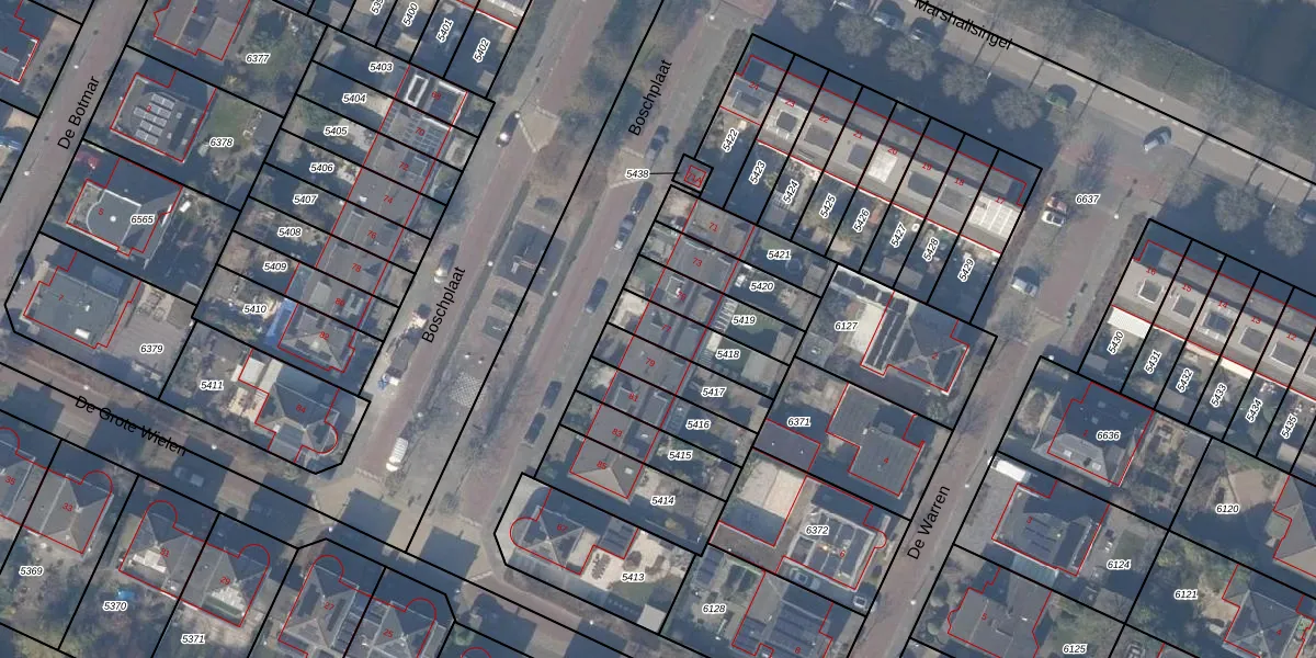 Het perceel waarop Boschplaat 77 staat heeft een oppervlakte van 160 m². Dit is een middelgroot perceel. De perceeloppervlakte wordt geregistreerd door het Kadaster. Gedetailleerde informatie over de maten van dit perceel kunt u vinden in het rapport Kadastrale kaart met maatvoering van Boschplaat 77.