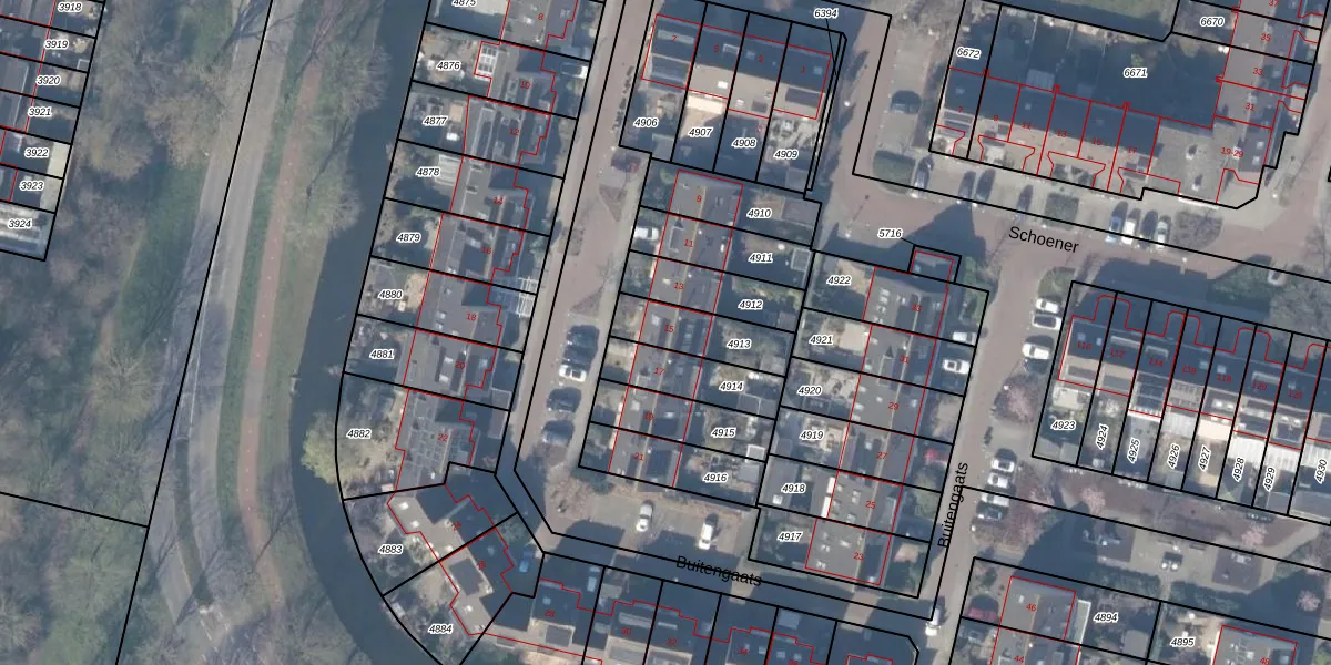 Het perceel waarop Buitengaats 15 staat heeft een oppervlakte van 181 m². Dit is een middelgroot perceel. De perceeloppervlakte wordt geregistreerd door het Kadaster. Gedetailleerde informatie over de maten van dit perceel kunt u vinden in het rapport Kadastrale kaart met maatvoering van Buitengaats 15.