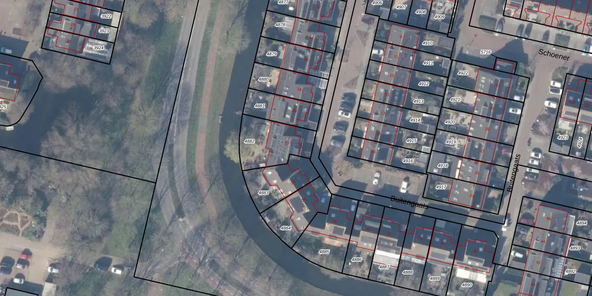 Het perceel waarop Buitengaats 22 staat heeft een oppervlakte van 343 m². Dit is een groot perceel. De perceeloppervlakte wordt geregistreerd door het Kadaster. Gedetailleerde informatie over de maten van dit perceel kunt u vinden in het rapport Kadastrale kaart met maatvoering van Buitengaats 22.